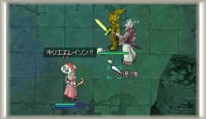 これは、ある程度打ち合わせをしてあるか、意思疎通の出来る慣れた相手じゃないと、「なんてこったい!」な結果になってしまいますが、カズサ、ぎょペアの場合、本部屋入り口にてキリエをもらい、カズサはインデュアをしながら赤矢印方向へ。ぎょは、カズサにキリエをかけてから黄色の矢印方向へすすみます。